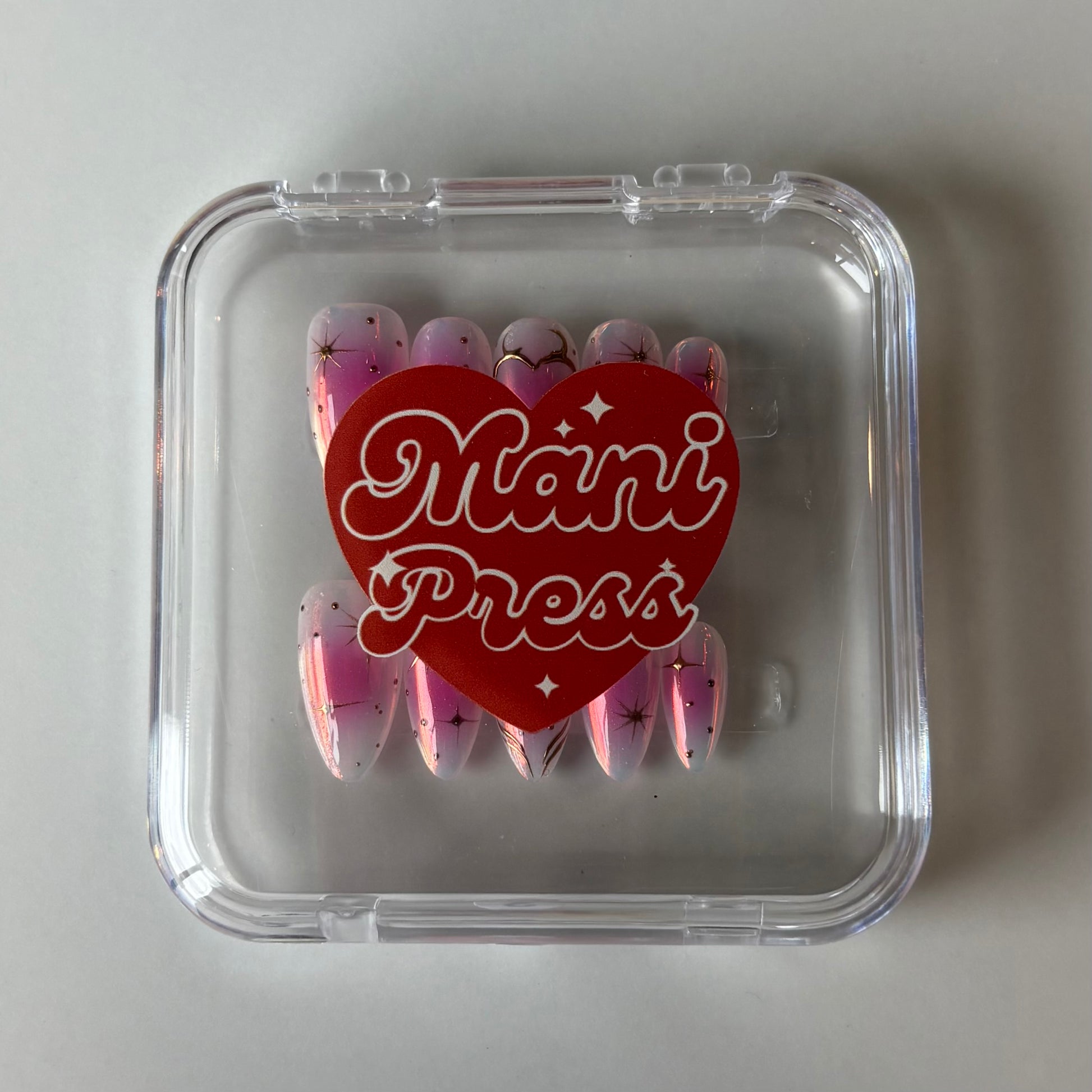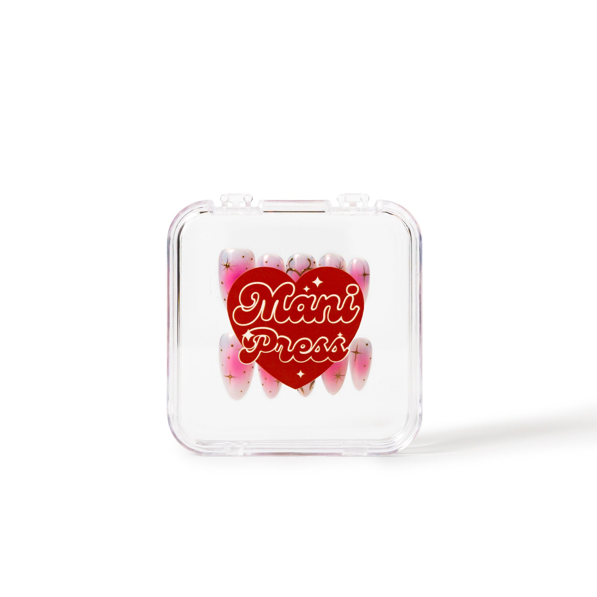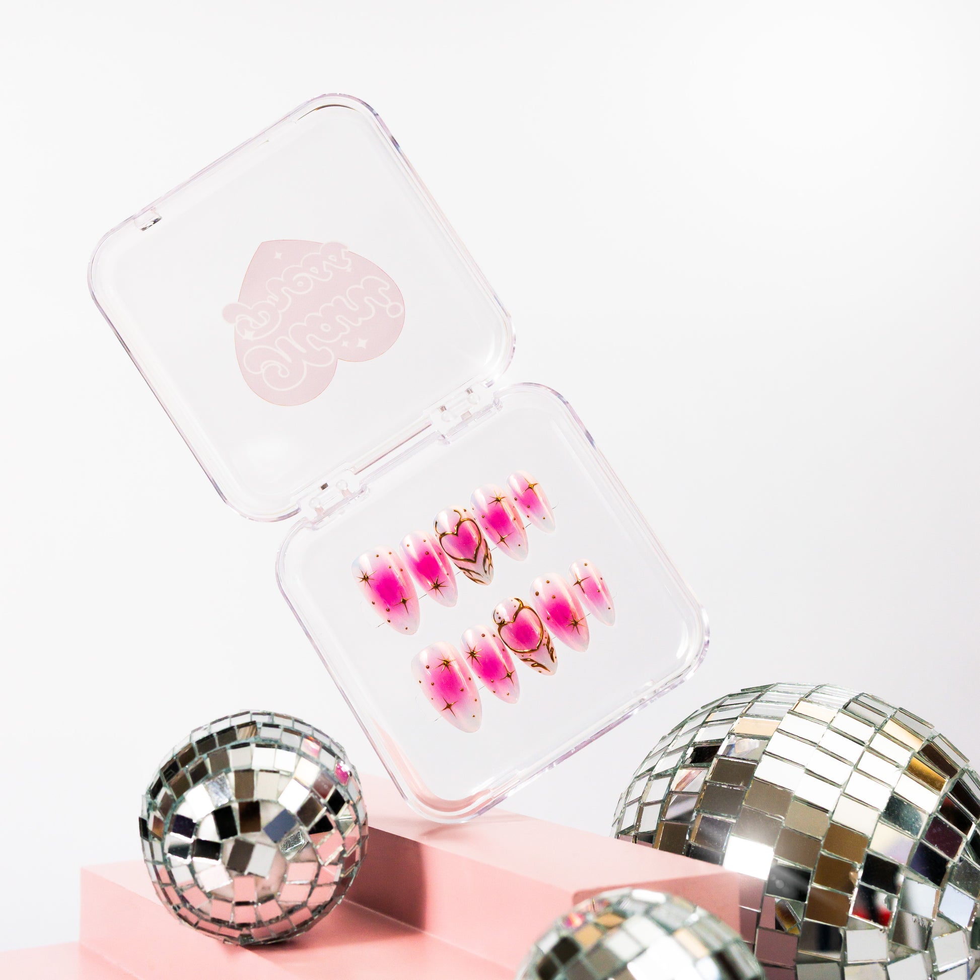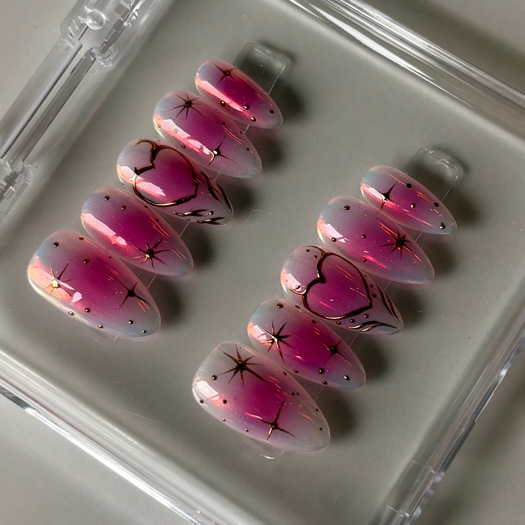 Add a playful touch to your look with this set featuring pinks, hearts and sparkling accents.