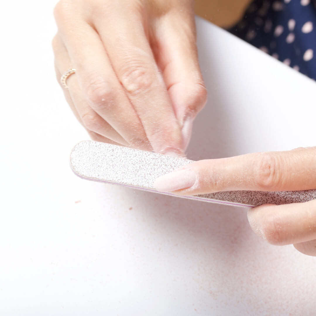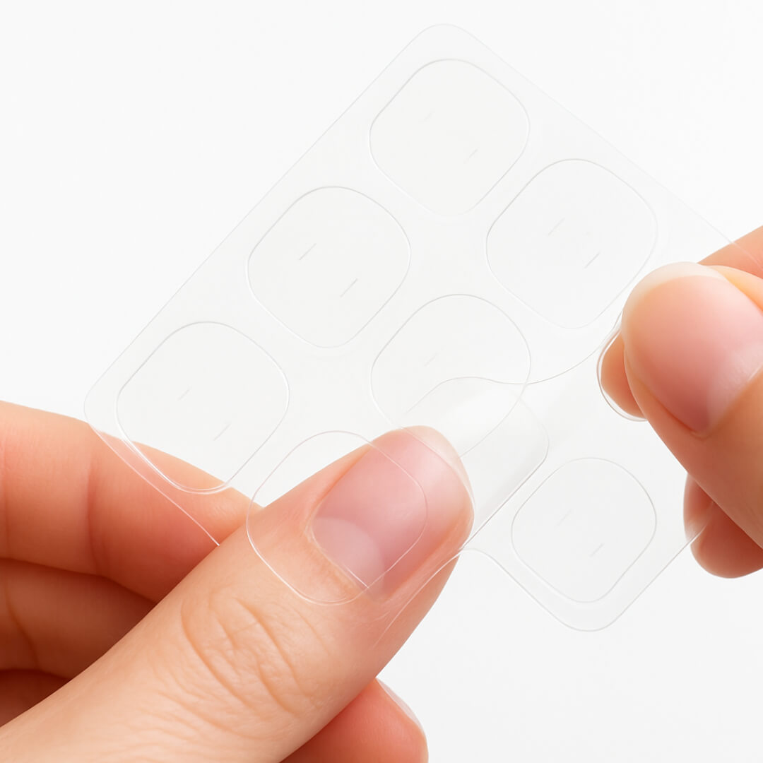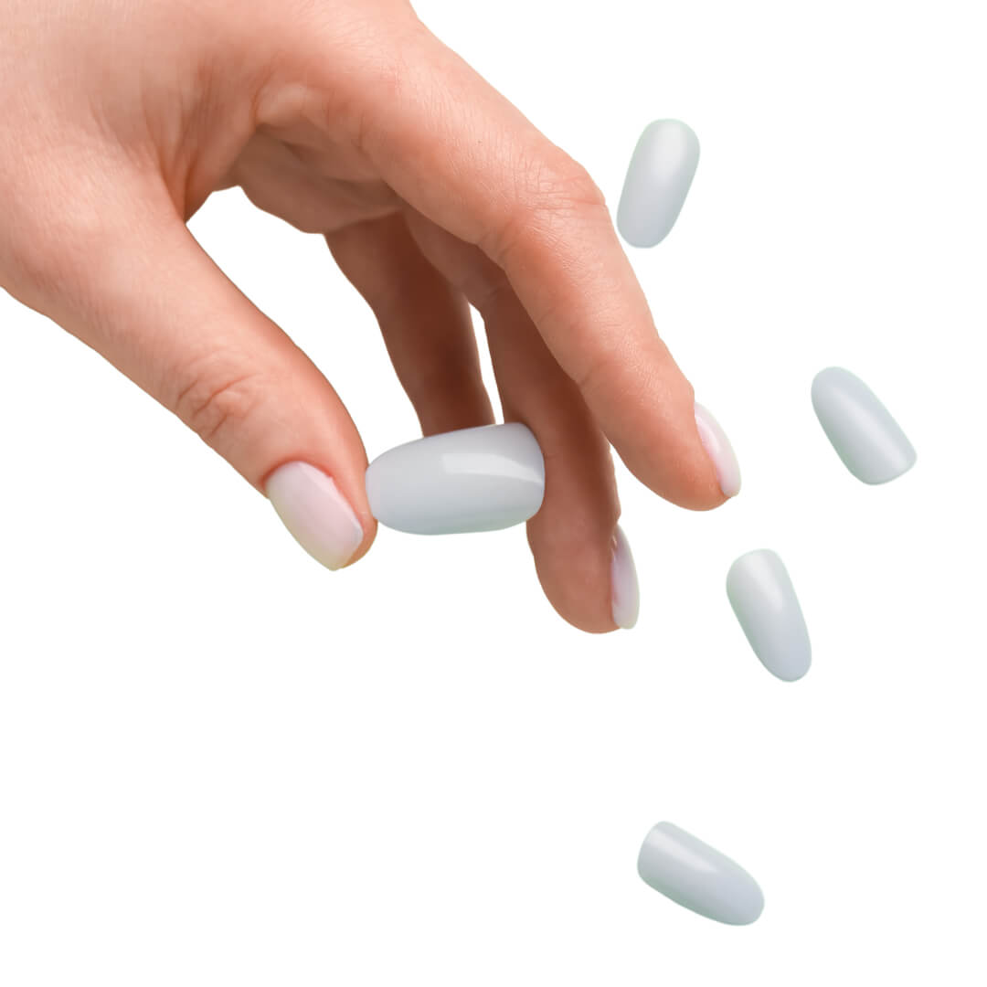 Apply nail adhesive, press each nail for 30 seconds, and repeat for all fingers.